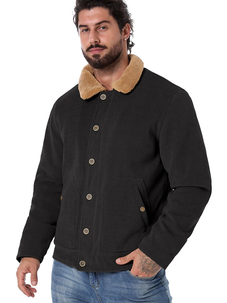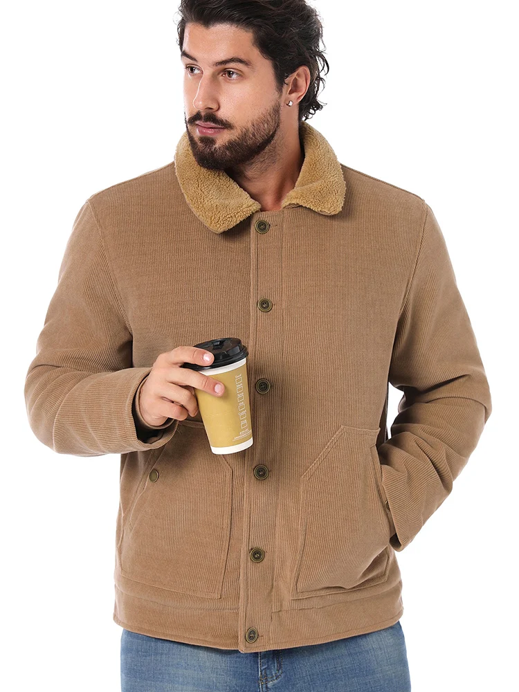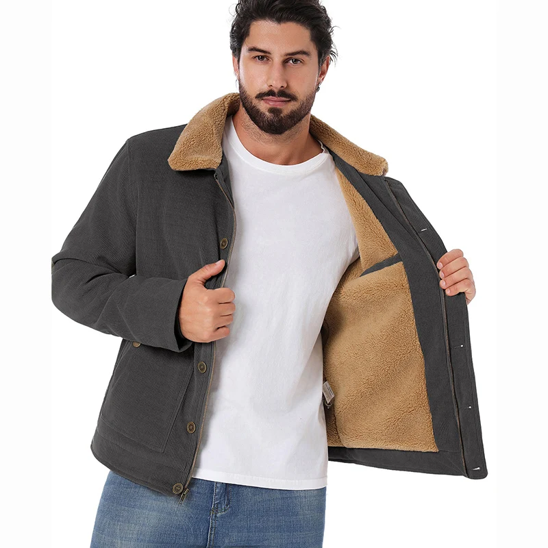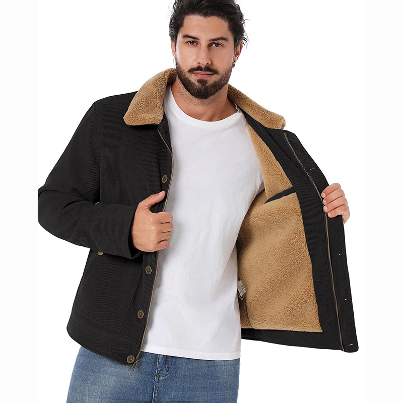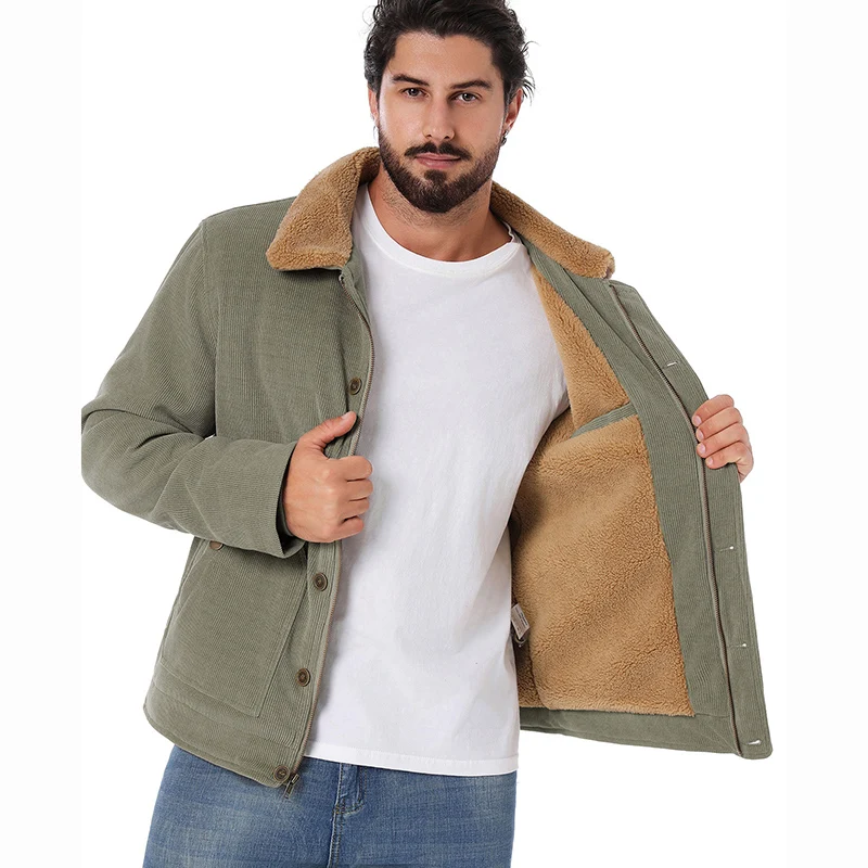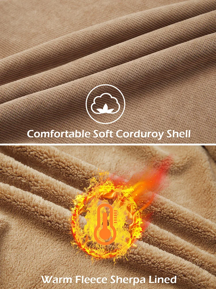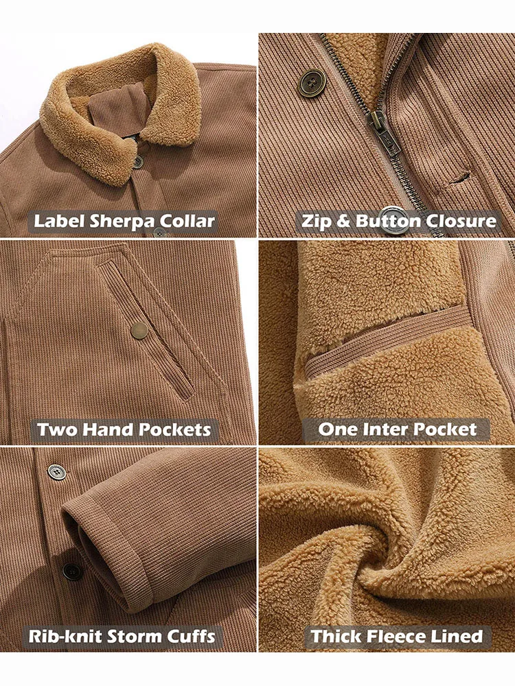Men's Corduroy Jacket Fleece Warm Lined Cargo Work Jacket Casual Thick Sherpa Collar Coats