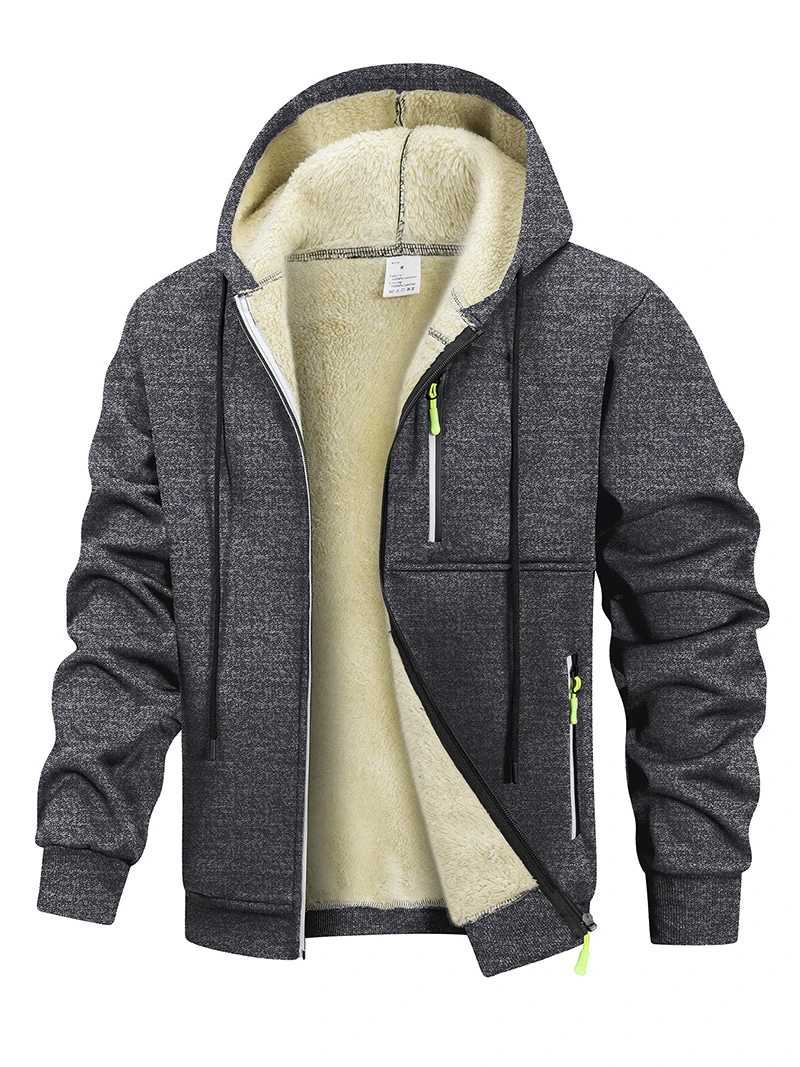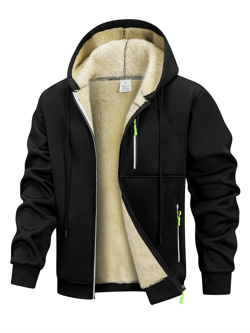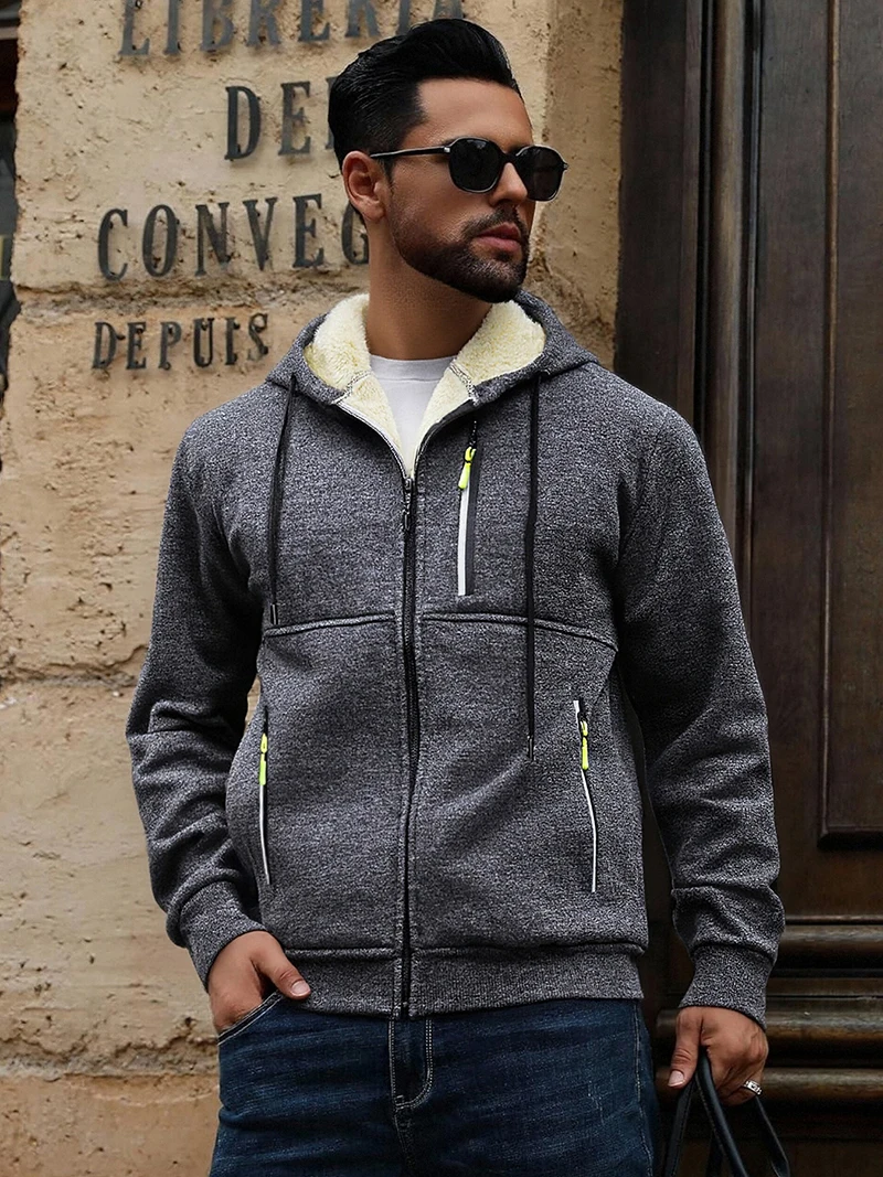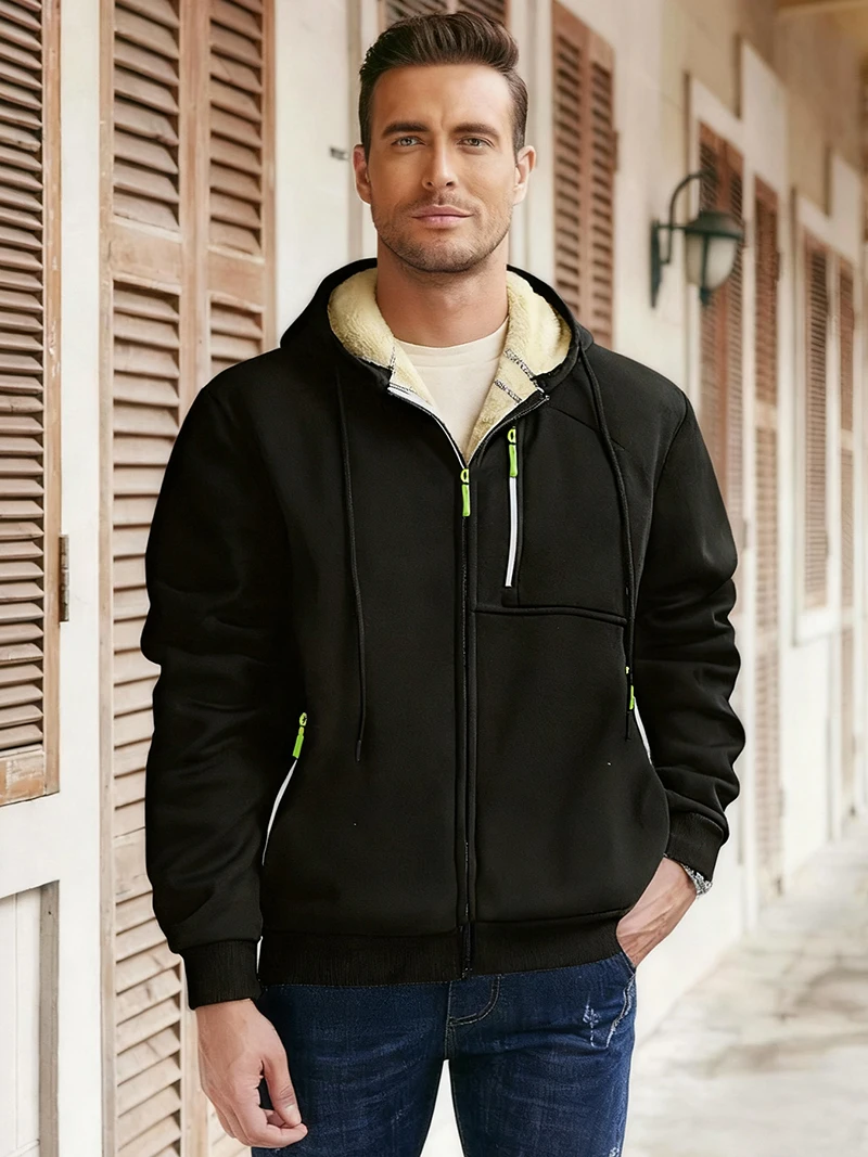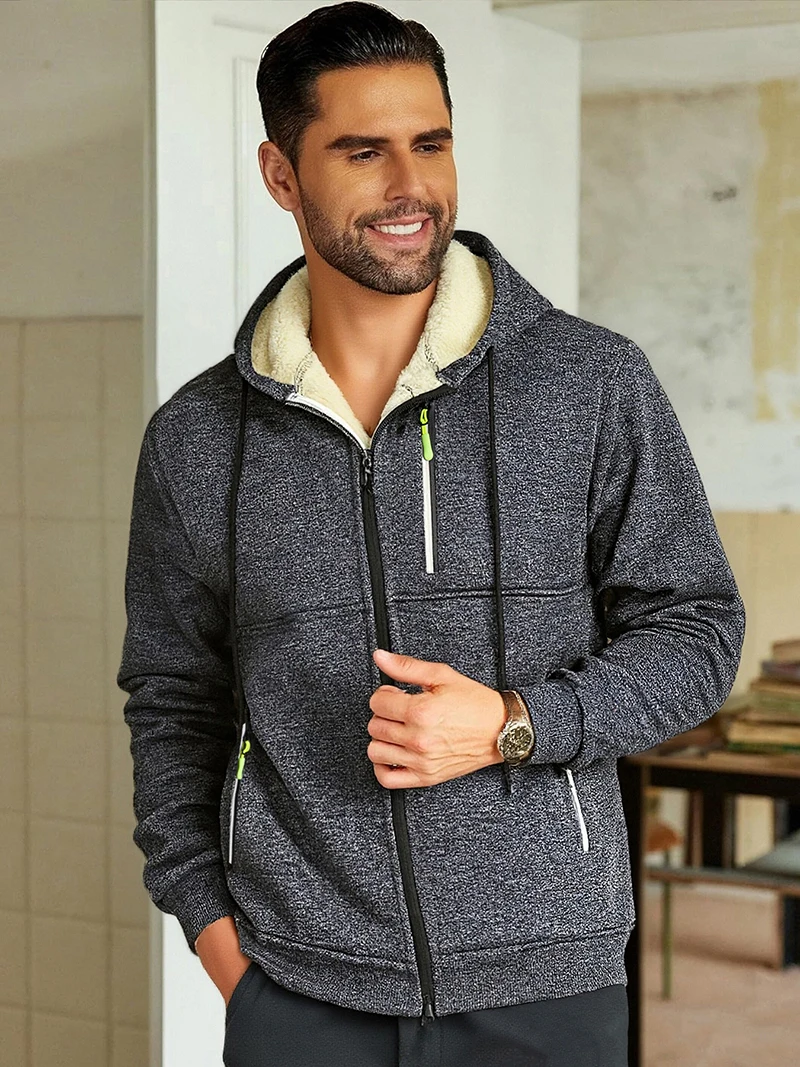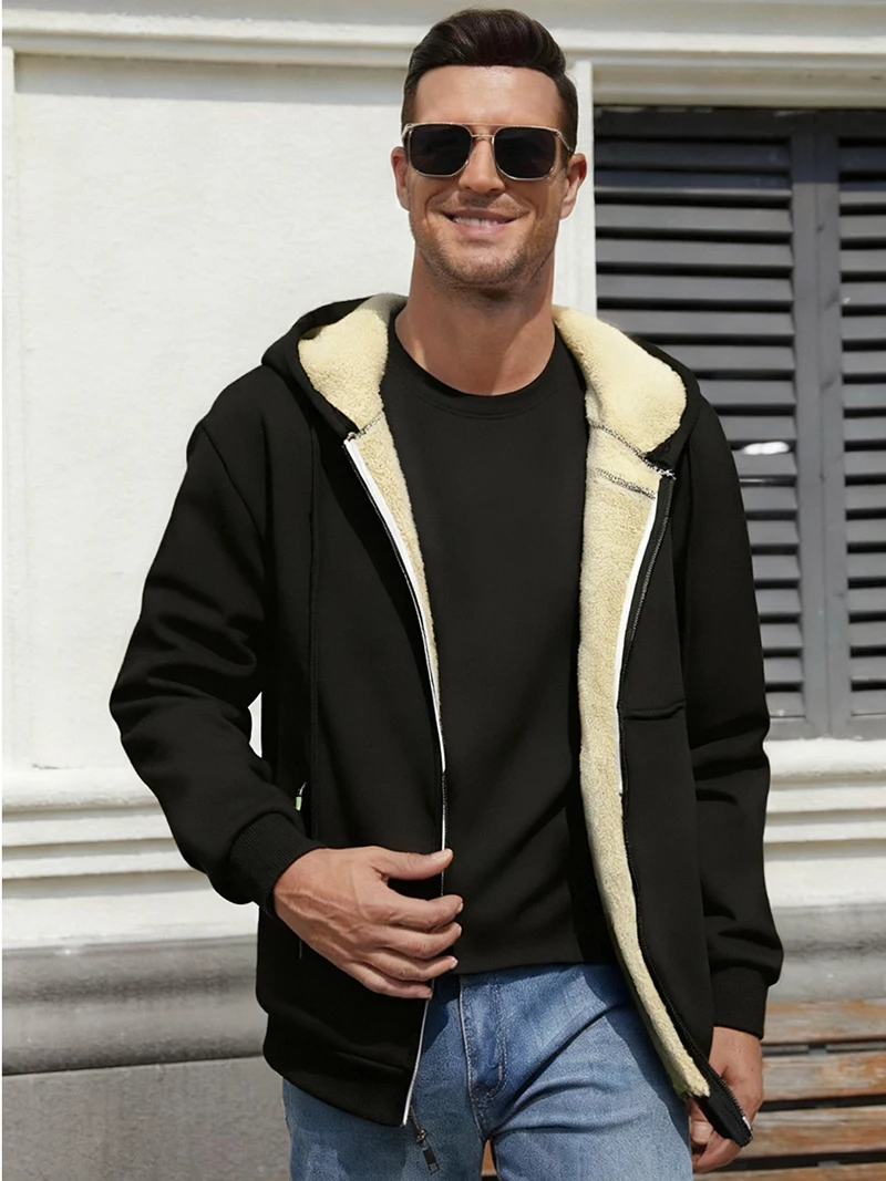 Men's Warm Sherpa Plush Lined Jacket Casual Zip Up Hooded Coat with Zipper Pockets Fleece Outerwear